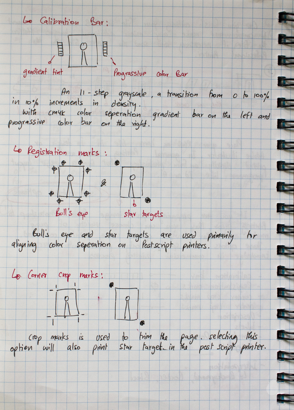 A registration marks appear on the four corner of the image along with the star target. These are used for alignments of color separation on post-scrip printers. A corner crop mark and center crop marks appears at the corner and center of the image is an information for trimming paper.