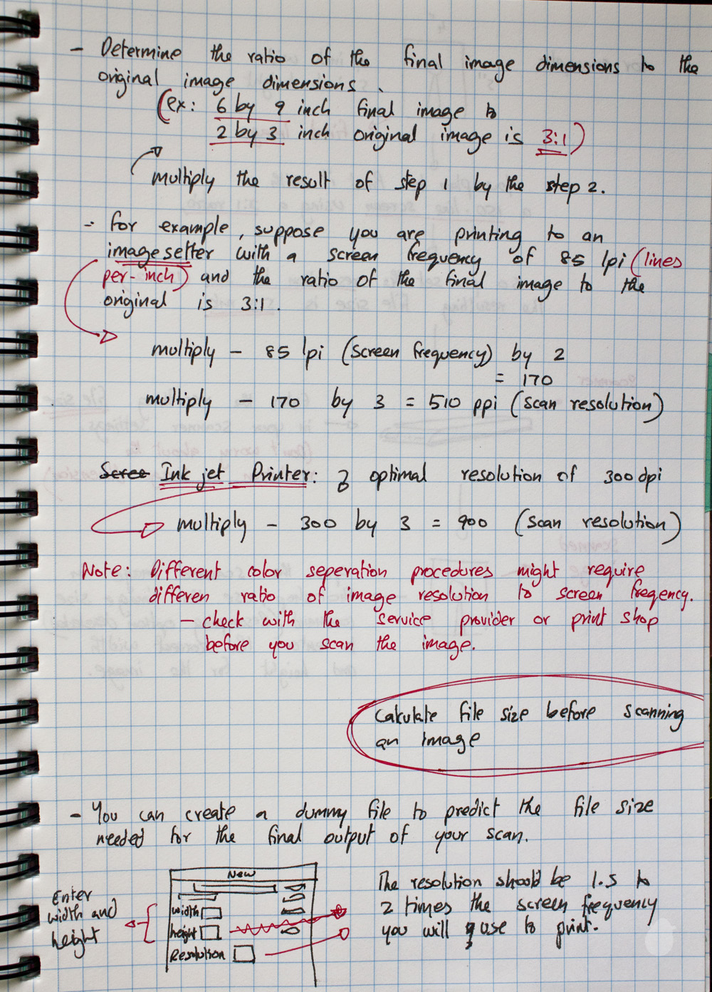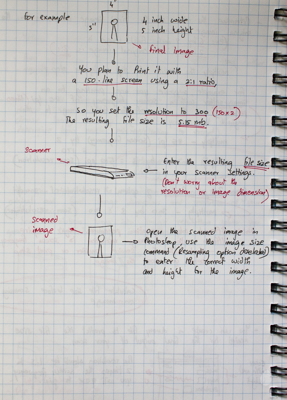For example, if the final image is 4 inches wide and 5 inches height. You plan to print it with a 150 line screen using a 2:1 ratio, set the resolution to 300 and the resulting file size will be 5.15 MB. Enter the file size of 5.15 on your scanner setting to scan the image. Once the scan is done you can bring it to photoshop and enter the width and height for the final image.